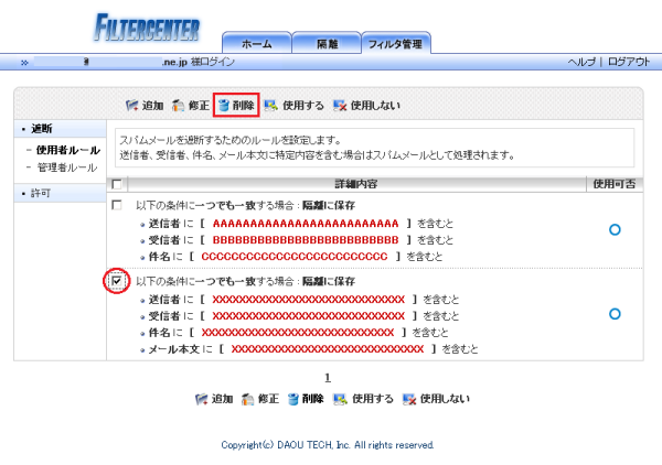 1.[フィルタ管理]の画面で、[遮断]の[管理者ルール]をクリックします。