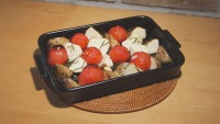 1.オーブン皿に食べやすく切った根菜とミニトマトをのせ、Aを全体にまぶしつける。